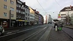 An der Straße befinden sich u. a. drei- bis viergeschossige Nachkriegsbauten.