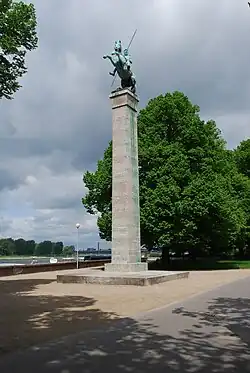1925, kurz nach der Ruhrbesetzung, bei der Düsseldorf das Hauptquartier der französischen Besatzer gewesen war, regte sich eine Initiative ehemaliger Ulanen, für gefallene Kameraden ein Denkmal in Düsseldorf zu errichten. Diese Initiative wurde angeführt von Generalmajor Adolf von Normann-Loshausen (1864–1927), dem letzten Regimentskommandeur vor dem Ersten Weltkrieg. Ein Standort am Napoleonsberg im Düsseldorfer Hofgarten, der zunächst in Betracht gezogen worden war, stieß auf den Widerstand des Hofgarten- und Friedhofausschusses der Stadt. Danach fassten die Planer einen Standort am Rhein vor dem Museumskomplex am Ehrenhof ins Auge. Ein erster Entwurf, den eine Denkmalkommission durch Wilhelm Kreis dafür entwickeln ließ, fand nicht die Zustimmung der Ulanen. Schließlich erhielt der Bildhauer Richard Langer für den Entwurf eines Reiterdenkmals den Zuschlag. Dieser Entwurf besteht aus einer schlichten Muschelkalk-Stele, auf deren 15,5 Meter hohen Spitze die 1673 kg schwere Bronzeskulptur eines mit Lanze bewaffneten Ulanenreiters auf einem steigenden Ross angebracht ist. Die Ausführung des rund 40.000 Mark teuren Auftrags ging an die Firmen Ernst Sandvoß aus Düsseldorf, Steinindustrie C. Vetter und Düsseldorfer Bronzeguß. Am 26. Mai 1929 wurde das Kriegerdenkmal feierlich eingeweiht. Festreden hielten Franz von Papen als Ehrenvorsitzender der Denkmalkommission und des „Verbandes ehemaliger 5. Ulanen“ sowie Robert Lehr als Oberbürgermeister Düsseldorfs.[3]