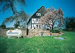 Seit 1954 ist Flüssiggas der Marke Westfalengas (DIN 51622) auf dem deutschen Markt erhältlich. Es besteht aus mindestens 95 Volumenprozent Propan und Propen sowie fünf Volumenprozent der Bestandteile Ethan, Butan und Butanisomeren.[23] Gewonnen wird es bei der Förderung von Rohöl und Erdgas sowie als Veredelungsprodukt von Raffinerien.