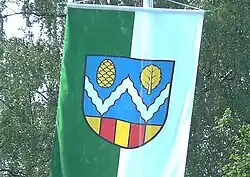 Blasonierung In Blau mit goldenem Schildfuß ein silberner Wellenbalken in W-Form, begleitet von goldenem Tannenzapfen und Buchenblatt; im Schildfuß zwei rote Pfähle.