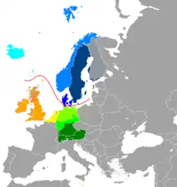 • Großgliederung der kontinentaleuropäischen Mundarten westgermanischer Abkunft.[13][14][15][16]