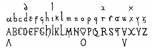 - ↑ Hans Foerster, Thomas Frenz: Abriss der lateinischen Paläographie, 3., überarbeitete Auflage, Stuttgart 2004, S. 136 f., 140; Bernhard Bischoff: Paläographie des römischen Altertums und des abendländischen Mittelalters, 4. Auflage, Berlin 2009, S. 130, 136.