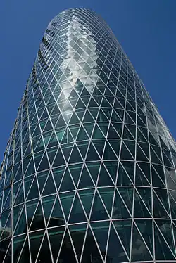 Das Hochhaus hat die Form eines Zylinders mit einem Durchmesser von 37,5 Metern. Da die Stockwerke als Quadrate angeordnet sind, entstanden zwischen der Innen- und Außenfassade 18 Wintergärten. Jedes der 30 oberirdischen Geschosse hat eine Mietfläche von etwa 820 Quadratmetern.