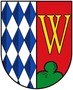 Blasonierung: „In gespaltenem Schild rechts von Silber und Blau gerautet, links in Rot auf grünem Dreiberg ein schwebender goldener Großbuchstabe W.“[20] |