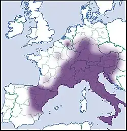 Die Westliche Haferkornschnecke ist in Mitteleuropa weit verbreitet, jedoch sehr zerstreut und streng gebunden an die Gebiete, in denen Kalk oder Dolomit an der Oberfläche ansteht. Sie kommt von der spanischen Mittelmeerküste (etwa Höhe Valencia), Süd- und Ostfrankreich, mit kleineren Vorkommen in Südbelgien, über die Schweiz, Süddeutschland, Österreich, Norditalien[6] bis nach Tschechien und isoliert in Bulgarien[7] vor. In Deutschland liegt das nördlichste Vorkommen in Thüringen (Hörselberge bei Eisenach).
