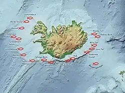 Vermutlich fand zudem im Jahre 1637 ein submariner Ausbruch südwestlich von Heimaey statt und hielt ca. 70 Tage an. Die submarine Eruption war wohl explosiv.[10] Auch finden sich Augenzeugenberichte über einen unterseeischen Vulkanausbruch 3,8 Seemeilen südöstlich von Geirfuglasker und gleichzeitig 3,6 Seemeilen südlich von Súlnasker im Jahre 1896, die in der Zeitschrift Ísafold 3 im Oktober desselben Jahres veröffentlicht wurden.[11] Die letzten Ausbruchsserien in diesem System fanden 1963–67 bei der Entstehung von Surtsey sowie 1973 v. a. auf Heimaey (Ausbruch des Eldfell) statt. In beiden Fällen stellte man innerhalb der Ausbruchsserien auch submarine Eruptionen an anderen Stellen im gleichen Vulkansystem fest.