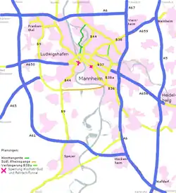 Als Haupteinfallstraße mit direkter Verbindung nach Ludwigshafen am Rhein nimmt die bestehende Straßenverbindung einen Großteil des allgemeinen Verkehrs aus Richtung Norden auf und dient zudem der Verkehrserschließung wichtiger Industrie- und Gewerbestandorte entlang der B 44, auf der Friesenheimer Insel sowie des Handels- und des Industriehafens. Die Straßenführung bedeutet für einige Wohngebiete in Sandhofen Neckarstadt-West und Jungbusch erhebliche Lärmbelastungen aufgrund des Durchgangsverkehrs.