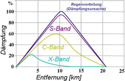 Dadurch ergeben sich für beide Radaranwendungen unterschiedliche Reichweitenbedingungen. Wenn ein Radar im S-Band als Flugsicherungsradar beispielsweise eine Reichweite von 100 km für Punktziele hat, dann erzielt das gleiche Radar als Niederschlagsradar eingesetzt eine Reichweite von 230 km für Volumenziele.[18]