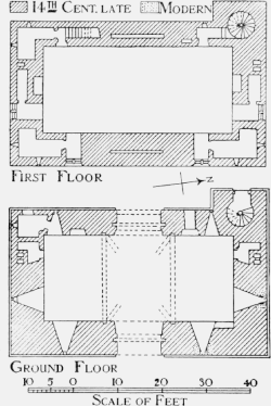 Die Burg verfiel Anfang des 14. Jahrhunderts oder wurde in dieser Zeit abgerissen; eine Quelle von 1343 beschreibt sie als Ruine.[5] Mitte des 14. Jahrhunderts fiel das Anwesen durch Heirat an John Darcy, der enge Verbindungen zum königlichen Hof hatte. Darcy ließ an der Burg wesentliche Veränderungen vornehmen und den Mound einebnen, damit er eine Basis für einen neuen Donjon mit einem befestigten Torhaus knapp östlich davon erhielt.[5][7] Es ist nicht bekannt, ob es auch eine Kurtine gab – man findet davon jedenfalls keine Überreste auf dem Anwesen –, aber die Burg wäre wohl ohne sie extrem schwer zu verteidigen gewesen. Das Fehlen jeglichen Beweises für eine Kurtine mag einfach dem viele Jahrhunderte lang andauernden Steindiebstahl geschuldet sein.[7]