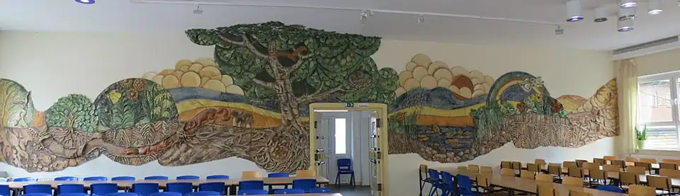 Das 14 Meter lange Bildwerk aus ursprünglich 300 Einzelteilen besteht aus grobkörnigem Schamotte-Ton. Es nimmt fast die gesamte Raumbreite ein und reichte ursprünglich ab etwa einem Meter vom Fußboden bis zur Deckenkante. Die Dietrichs beschreiben ihre damalige Arbeit wie folgt: „Damals gab es noch keine Fliesenkleber wie heute. Wir mussten also die einzelnen Elemente mit Zement anbringen, was Schwerstarbeit ist. Als wir vor Ort kamen, fielen wir aus allen Wolken. Die Wand war so schief, dass man unmöglich damit arbeiten konnte. Der Bauleiter erklärte uns schmunzelnd: ‚Das haben Lehrlinge als Abschlussarbeit gemacht. Die sind alle durchgefallen‘. Dazu kam, dass die Tragkraft nie ausgereicht hätte!“ Mit diesen zusätzlichen Herausforderungen dauerte die Anbringung der Reliefteile mehrere Wochen bis Weihnachten des Jahres 1980. Zum Inhalt heißt es „Kinder sehen die Natur und überlegen sich, was darunter, in der Erde, los ist. Dies haben wir versucht, darzustellen.“[2]
