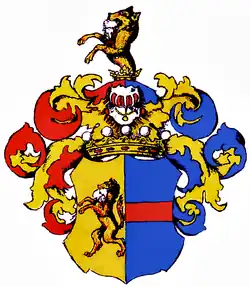 - 1760: Schild gespalten. Rechts in Gold ein rechtsgekehrter, aufgerichteter, natürlicher Wolf, mit aufgerichtetem Schweif, ein natürliches Lamm (nach anderen: einen weißen Widder) mit rechts und vorwärts gewandtem Kopfe im Rachen haltend. Links in Blau ein roter Querbalken. Auf dem Schild ruht die Freiherrnkrone. Darüber schwebt ein offener gekrönter Helm mit rechts rot-goldenen, links blau-goldenen Decken. Kleinod: Der Wolf mit dem Lamme des Schildes aus der Krone wachsend. Schildhalter sind zwei auf einer unter dem Schilde sich verbreitenden bronzenen Arabeskenverzierung stehende, auswärtssehende natürliche Wölfe mit zwischen den Hinterbeinen durchgezogenen Schwänzen.[5]