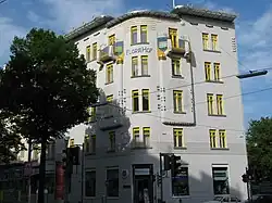 Das Haus wurde 1894 nach Plänen von Carl Holzmann erbaut und besitzt reichen barockisierenden Dekor und eine markante Eckkuppel.