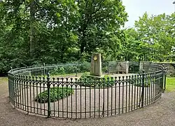 Am 25. Januar 1813, fünf Tage nach seinem Tod, wurde der Dichter selbst hier beigesetzt. Den schlichten dreiseitigen Grabobelisken ziert das von Wieland eigens zu diesem Zweck geschaffene Distichon „Liebe und Freundschaft umschlang die Verwandten Seelen im Leben und ihr Sterbliches deckt dieser gemeinsame Stein“. Man spricht vom „schönsten deutschen Dichtergrab“.[10]