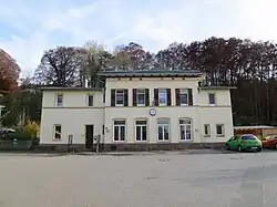 Am 1. Februar 1866 wurde die Bahnstrecke von München über Tutzing und Weilheim nach Unterpeißenberg eröffnet, an welcher der Bahnhof Wilzhofen entstand. Bis 1889 wurde die Strecke von Weilheim über Murnau nach Garmisch-Partenkirchen verlängert. Die Ammerseebahn wurde am 30. Juni 1898 durch die Königlich Bayerischen Staatseisenbahnen eröffnet.[13] An ihr entstand der Bahnhof Wielenbach. Das 1938 errichtete Empfangsgebäude ist ein einstöckiger gemauerter Bau, der mit Holz verkleidet ist. Es enthielt Schalter- und Dienstraum sowie eine Güterhalle. Neben dem durchgehenden Hauptgleis am Hausbahnsteig besaß der Bahnhof ein aus Richtung Raisting nach Osten abzweigendes Ladegleis, an dem hauptsächlich landwirtschaftliche Güter und Kleintiere verladen wurden. Vom Bahnhof aus wurden drei Schranken bedient. Zuletzt wurde der Bahnhof Wielenbach von den meisten Zügen ohne Halt durchfahren oder nur noch als Bedarfshalt bedient. 1983 wurde der Bahnhof stillgelegt und nur noch als Blockstelle betrieben. Das Ladegleis wurde abgebaut und das Empfangsgebäude 1988 verkauft. Das Gebäude ist, erheblich umgebaut, erhalten.[14][15]
