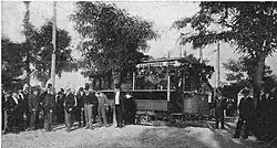 Verwirklicht wurde die Bahn allerdings erst aus Anlass des auf dem Gebiet des Schießplatz Kagran (heutiger Donaupark) stattfindenden VI. Österreichischen Bundesschießen zum 50-jährigen Thronjubiläums Kaiser Franz Joseph. Finanziert wurde die WKB durch das Berliner Bankhaus Koenen & Co. und programmgemäß am ersten Tag des Schützenfestes, dem 26. Juni 1898 feierlich eröffnet.[1] Ursprünglich war geplant, zwischen Praterstern und der Reichsbrücke die Strecke der 1897 in Betrieb genommenen Transversallinie der WT, der ersten elektrischen Straßenbahn in Wien, mittels eines Péage-Vertrages mitzubenützen.[1][2] Die scheiterte jedoch an der geringfügig unterschiedlichen Spurweite (1435 zu 1440 mm) der aus Hamburg übernommenen Fahrzeuge. Die eigens von der WKB erbaute Stockgleisanlage am Praterstern wurde daraufhin wieder abgebaut.[3] Die Streckenmitbenutzung in der Lasallestraße wäre aber aus vertraglichen Gründen ohnedies nur bis zum Ende des Bundesschießens am 6. Juli 1898 möglich gewesen.[1]