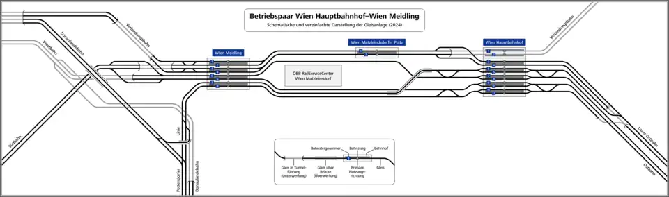 Der Hauptbahnhof und der weiter westlich gelegene Bahnhof Wien Meidling arbeiten betrieblich als zusammenhängende Einheit, die Züge halten an beiden Stationen.