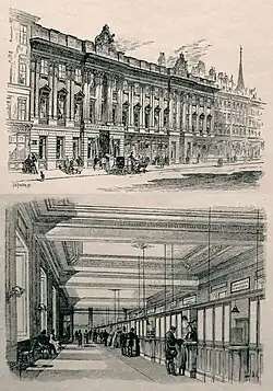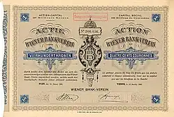 - ↑ Vgl. Meyers Konversationslexikon, 4..Auflage, 16. Band, Stichwort Wien: „1888 gab es in W. im ganzen 14 Banken mit einem eingezahlten Aktienkapital von 273 Mill. Gulden. Die bedeutendsten derselben sind: die k. k. privilegierte Österreichisch-Ungarische Bank (gegründet 1816, bis 1878 unter der Firma Österreichische Nationalbank, mit dem ausschließlichen Rechte der Ausgabe von Banknoten, Gesellschaftskapital 90 Mill. Guld.), die Österreichische Länderbank (gegründet 1880, Kapital 46,8 Mill.), die Österreichische Kreditanstalt für Handel und Gewerbe (gegründet 1855, Kapital 40 Mill.), der Wiener Bankverein (gegründet 1869, 25 Mill.), die Anglo-österreichische Bank (gegründet 1863, 18 Mill.), die Unionbank (gegründet 1870, 12 Mill.), die Niederösterreichische Eskomptegesellschaft (gegründet 1853, 9,8 Mill.), die Allgemeine Bodenkreditanstalt (gegründet 1864, 9,6 Mill. Guld.).“