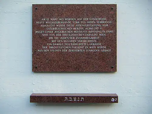 Nachdem die Juden verbrannt oder getötet oder ausgewandert waren, konfiszierte der Herzog den zurückgelassenen Besitz und ließ die Synagoge abreißen. Die Steine der ehemaligen Synagoge wurden für den Bau der Universität Wien verwendet.