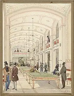Als das Spielen ab Mitte des 19. Jahrhunderts günstiger wurde, fand es schnell eine größere Verbreitung.[7] Zu dieser Zeit entstand auch der typische Wiener „Kaffeehausbillard“, ein kleinerer als der übliche Karambolagetisch mit den Sondermaßen 95 × 190 cm. Bekannte Billardcafés waren zu der Zeit unter anderem Café Adami (1728–1866, benannt nach Dominik Adami),[8] Regensburger Hof, Silbernes Kaffeehaus (1808–1855, insgesamt 28 Tische),[9] und Café Stierböck (ab 1790 bis zum Abbruch des Hauses).[10] Meist befand sich in den Cafés auch gleichzeitig eine Billardschule bzw. -universität. Ab 1845 mussten die Kaffeesieder eine Steuer, Billardabgabe genannt, entrichten, deren Abschaffung 1895 von der Genossenschaft gefordert wurde.