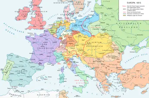 Der Wiener Kongress, der vom 18. September 1814 bis zum 9. Juni 1815 stattfand, ordnete nach der Niederlage Napoleon Bonapartes in den Koalitionskriegen Europa neu. Nachdem sich die politische Landkarte des Kontinentes als Nachwirkung der Französischen Revolution erheblich verändert hatte, legte der Kongress wiederum zahlreiche Grenzen neu fest und schuf neue Staaten.