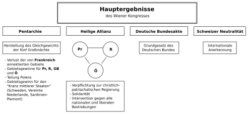 Was die Gestaltung der inneren staatlichen Zustände angeht, war der Kongress eher von restaurativen Grundsätzen und einer grundsätzlichen Skepsis gegenüber allen revolutionären, liberalen und nationalen Bestrebungen geprägt. Für die deutschen Staaten war die Schaffung des Deutschen Bundes das zentrale Ergebnis des Kongresses. Der Deutsche Bund war aber in den Augen vieler Zeitgenossen primär ein Instrument zur Unterdrückung nationaler und liberaler Bewegungen.[26] Es gelang allerdings nicht, die liberal bürgerlichen Bewegungen auszuschalten. Diese forderten den Nationalstaat, statt ein Bündnis von monarchischen Einzelstaaten.