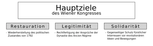 In diesen Zusammenhang gehört auch der Grundsatz der Restauration der vorrevolutionären politischen und gesellschaftlichen Verhältnisse. Die Restauration sollte zwar nicht so weit gehen, dass alle seit 1789 eingetretenen Veränderungen wieder rückgängig gemacht werden sollten, sehr wohl sollte aber allen zukünftigen revolutionären Bestrebungen ein Riegel vorgeschoben werden. Dazu zählten nicht nur die freiheitlichen, sondern auch die nationalen Bewegungen der Zeit.