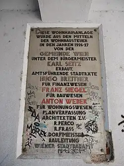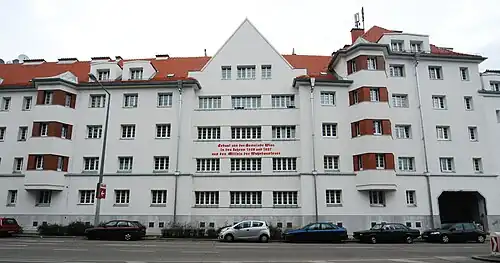 Diese städtische Wohnhausanlage mit 162 Wohnungen wurde 1931/32 von Carl Witzmann errichtet. Es handelt sich um einen Straßenhof mit Bänder- und Balkongliederung.