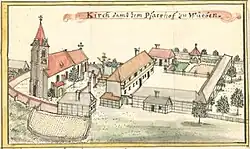 Nikolaikirche – Darstellung der Kirchen mit Pfarrhaus aus der Mitte des 18. Jahrhunderts