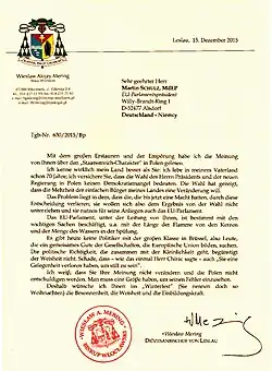 Am 15. Dezember 2015 sandte er einen Brief an den EU-Parlamentspräsidenten Martin Schulz und kritisierte darin dessen Bezeichnung der Gesetzesänderungen nach den Parlamentswahlen in Polen 2015 als „Staatsstreich“.