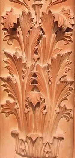 Johann Jacob Höppli (Schweiz 1822–1876 Wiesbaden), Bildhauer und Modelleur, kam 1846 nach Wiesbaden. 1850 gründete er in der Wörthstraße 4–6 seine „Thonwaaren und Fayencen-Fabrik“, dessen Innenhof noch heute vier Karyatiden, Arbeiten von seiner Hand, schmücken.[45] Höppli verdankt Wiesbaden die ornamentalen Terrakotta-Verzierungen etlicher Villen im Stadtbereich und vereinzelt aber auch einfacher Wohnhäuser in seinen Vororten. Besonders prunkvoll gestaltete Höppli das Portal der Marktkirche aus gebranntem Ton, des Weiteren deren Gesimse und Kreuzblumen. Als Höppli 1876 starb, wurde er in Wiesbaden auf dem Alten Friedhof begraben. Sein Grabmal wurde aus „Ignoranz gegenüber Wiesbadener Kunsthandwerk und mangelndem Denkmalschutz“[46] entsorgt.