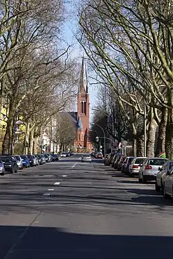 | Die evangelische Kirche Zum Guten Hirten auf dem Friedrich-Wilhelm-Platz am östlichen Ende der Wiesbadener Straße | |
