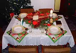 Nachdem der Abendstern aufgegangen ist[2] und man gebetet, die Weihnachtsoblate geteilt und die Geschichte von der Geburt Jesu gelesen hat, beginnt das Abendessen, nachdem man den ganzen Tag über gefastet hat.[5]
