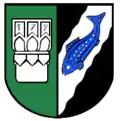 Blasonierung: „Gespalten von Grün und Schwarz; vorn ein silberner stilisierter Taufstein; hinten ein silberner schräglinker Wellenbalken, belegt mit einer blauen Forelle figurweise.“