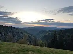 Die Wilde Gutach beim Austritt aus den Engtälern von Wildgutach in das breitere Simonswälder Tal (vorn) | ||