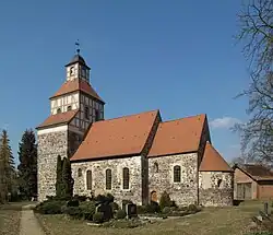 Beim Bau der Kirche aus äußerst spröden und harten Granitbrocken sollen die Zisterzienser-Mönche des Klosters Lehnin beratend tätig gewesen sein. Der Westturm ist aus nahezu würfelförmig behauenen Feldsteinen geschichtet und hat eine Länge von 5,85 und eine Breite von 11,55 Metern. Er übertrifft die Breite des Kirchenschiffs, die bei 10,5 m liegt (Länge 11,2 m). An das Schiff schließen sich ein schmaler Chor (Breite 8,25 m, Länge 5,85 m) und eine gleichfalls schmale Apsis an. Die mittelalterliche Dachdeckung bestand wahrscheinlich aus Mönch und Nonne Ziegeln. Das Dach der Apsis wurde vermutlich um 1600 neu errichtet. 1737 erhielt der Breitturm einen Fachwerkaufsatz, der nach zwischenzeitlichen Veränderungen 1992 auf den dokumentierten Ursprungszustand von 1737 zurückgeführt wurde. Auf dem 24 Meter hohen Turmknauf krönt die Wetterfahne von 1737 mit der Inschrift „A.F.v.R.“ des Patronatsherren Leutnant der Garde Adolph Friedrich (II.) von Rochow[33] den Bau.[34]