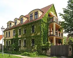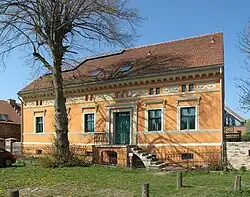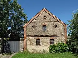 - Das ehemalige Pfarrhaus, ein traufständiges mitteldeutsches und verputztes Backsteinhaus. Das 1½-stöckige und 3-zonige Gebäude ist gleichfalls quer aufgeschlossen und mit einem Krüppelwalmdach aus Biberschwänzen gedeckt.
