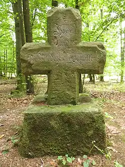 Das brusthohe Kreuz auf einem rund 30 cm hohen Sockel erinnert mit Inschriften auf beiden Seiten an zwei Wilderer, die 1817 und 1870 in diesem Waldstück erschossen wurden. Es ähnelt damit mittelalterlichen Sühnekreuzen.