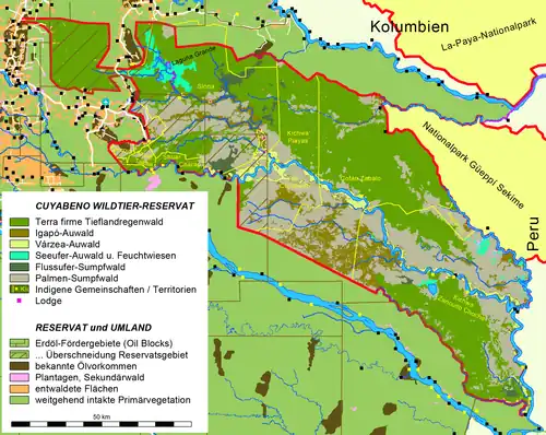 - ↑ a b c d e Cristina Casavecchia: Estudio de Caso Ecuador: RESERVA DE PRODUCCIÓN DE FAUNA CUYABENO, 2014, pdf-Version, IUCN, Quito (Ecuador), abgerufen am 17. Februar 2019.