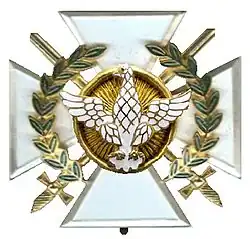 Das Ordenszeichen besteht aus einem silbernen, weißemaillierten Kreuz, auf dessen goldenem Medaillon sich der weiße Falke befindet, dessen Flügel darüber hinausragen. Über den Seitenbalken ist ein grüner Lorbeerkranz gelegt, durch die Mitte sind Schwerter gekreuzt.
