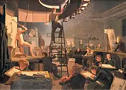 Wilhelm Bendz: Aktunterricht an der Kunstakademie, 1826, Öl auf Leinwand, 57,7 × 82,5 cm, Statens Museum for Kunst. Bendz hat sich links am unteren Rand selbst abgebildet. Sein Gesichtsausdruck und das Verhalten einiger Studenten zeigen eine kritische oder unernste Einstellung zum traditionellen akademischen Betrieb.[1]