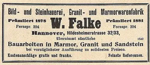 1878 firmierte W. Falke dann in der Hildesheimerstraße 32/33p[1] und wurde im selben Jahr sowie 1881 für ihre Arbeiten ausgezeichnet.[2]