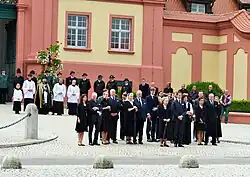 Wilhelm Herzog von Württemberg mit seiner Familie am 1. Juli 2022 anlässlich der Trauerfeierlichkeiten für seinen verstorbenen Großvater vor Schloss Altshausen. Wilhelm von Württemberg steht im Bild vorne rechts neben seiner Großmutter, Diane Herzogin von Württemberg.