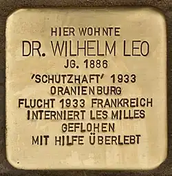 Bereits kurz nach Machtergreifung wurde Leo am 28. Februar 1933 von der SA verhaftet, misshandelt und in das Konzentrationslager Oranienburg verbracht. Seine Familie erreichte mit Hilfe von Ernst Wiechert nach einigen Monaten die vorläufige Freilassung. Nachdem die Behörden seine Anwaltszulassung widerrufen und seine Konten gesperrt hatten, floh Leo im August 1933 mit seinem zehnjährigen Sohn über Belgien nach Paris; seine Frau und Töchter folgten Ende 1934 nach. Dort eröffnete er in seiner Wohnung in der Rue Meslay die deutsch-französische Buchhandlung LIFA (Librairie Franco-Allemande).[2] In Paris trat er der SPD bei, wurde ehrenamtlich Justitiar des Schutzverbandes deutscher Schriftsteller im Ausland und wirkte in dem von Heinrich Mann geführten Ausschuss zur Vorbereitung einer deutschen Volksfront mit. 1939 wurde er im Lager Les Milles in Aix-en-Provence interniert, konnte aber fliehen und lebte bis September 1944 im Untergrund, unter anderem unter dem Namen León Willer in Cazaubon. Nach der Rückkehr nach Paris wurde er Mitglied im Nationalkomitee Freies Deutschland für den Westen (KDFW frz. CALPO). Nach der Befreiung Frankreichs wurde er Vizepräsident des KDFW und Vorsitzender seiner Kriegsverbrecher-Kommission.[3] Wilhelm Leo starb am 11. November 1945 in Paris an einem Herzinfarkt.
