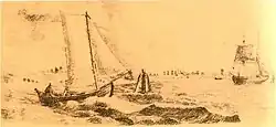 - Warnemünder Fischer-Jolle auf der Fahrt nach Rostock, in der Höhe von Langenort kreuzend. um 1835, Feder[8]