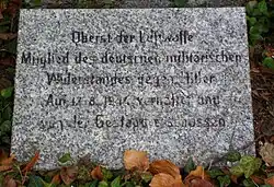 - Dem Kommandanten der Invalidensiedlung, der wegen seiner Teilnahme am Widerstand gegen das Hitler-Regime unmittelbar vor Ende des Krieges von den Nationalsozialisten ermordet wurde, zum Gedenken.