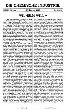 - Friedrich Lenze: Wilhelm Will †. In: Zeitschrift für angewandte Chemie. 33. Jahrgang. Ausgabe 34 vom 27. April 1920, S. 101/102