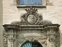 Inschrift und Wappen am Portal der St. Margaretha-Kirche in Sichtigvor