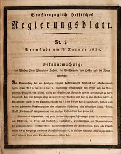 - ↑ Bekanntmachung, das Ableben Ihrer Königlichen Hoheit, der Großherzogin von Hessen und bei Rhein betreffend vom 27. Januar 1836. In: Großherzoglich Hessisches Regierungsblatt Nr. 4 vom 28. Januar 1836, S. 33f.