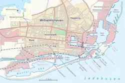 Die Gründung Wilhelmshavens geht auf den Plan Preußens zurück, an der Nordsee einen Marinestützpunkt einzurichten. Zu diesem Zweck erwarb es 1854 von Oldenburg ein kleines als Jadegebiet bezeichnetes Territorium, auf dem neben den militärischen Hafenanlagen auch die Stadt Wilhelmshaven entstand. Die Reichsverfassung von 1871 bestimmte den „Jadehafen“ zum Reichskriegshafen.[12] Die Stadtgeschichte Wilhelmshavens ist seitdem eng mit der Entstehung und Entwicklung der deutschen Marine verbunden. Anfangs bestanden außerhalb der preußischen Stadt Wilhelmshaven mehrere Gemeinden, die zum Land Oldenburg gehörten, und auf deren Gebiet ein Teil der Hafenanlagen lag. Sie bildeten ab 1911 die Stadt Rüstringen, die 1937 mit Wilhelmshaven vereinigt wurde.