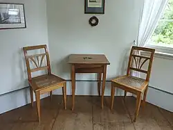 Die beiden Obergeschosse sind ebenfalls im Stil des Klassizismus eingerichtet und in der Art von Wohnräumen des 19. Jahrhunderts mit Tapeten, Gardinen und Möbeln ausgestattet. Die Möblierung der Obergeschosse besteht aus einem Paar Stühlen mit kleinem Tisch, einem Sekretär, Marianne von Willemers Toilettentisch[4] sowie einer kleinen Anzahl von Schauvitrinen. An den Wänden hängen gerahmte Bilder mit verschiedenen Porträts von Goethe und Willemer, mit Briefkopien sowie mit einigen zeitgenössischen Frankfurter Landschaftsdarstellungen, darunter Darstellungen des originalen Gartenhäuschens und der Gerbermühle. Ein besonderes Ausstellungsstück ist ein Faksimile des Papierbogens mit dem handschriftlich aufgezeichneten Gedicht Gingo biloba, das Goethe im Jahr 1815 mit zwei Ginkgo-Blättern verziert Marianne von Willemer gewidmet hatte (siehe nebenstehendes Foto).